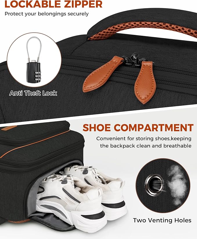 - Easy Luggage Packing: The tsa backpack carry on includes two packing cubes for clothes and a water-resistant bag for toiletries, helping you easily organize your items. It also has a separate shoe compartment at the bottom. The compartment is spacious enough to fit size 10-12 shoes for both men and women, which can also double as toiletry bags or for other purposes. Two ventilation holes in the shoe compartment ensure breathability