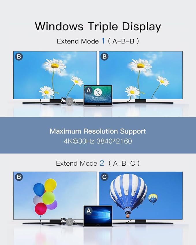 - Laptop Docking Station dual monitor: Simply connect docking station with the HDMI port and you can enjoy Ultra HD video instantly(Single Display Up to 4K@30Hz). Hdmi splitter for dual monitors support mirror or extend mode with crystal clear 3D visual and high quality video experience through 2 HDMI ports. You can do different project on different monitors which provide you more space for work, good for home office.