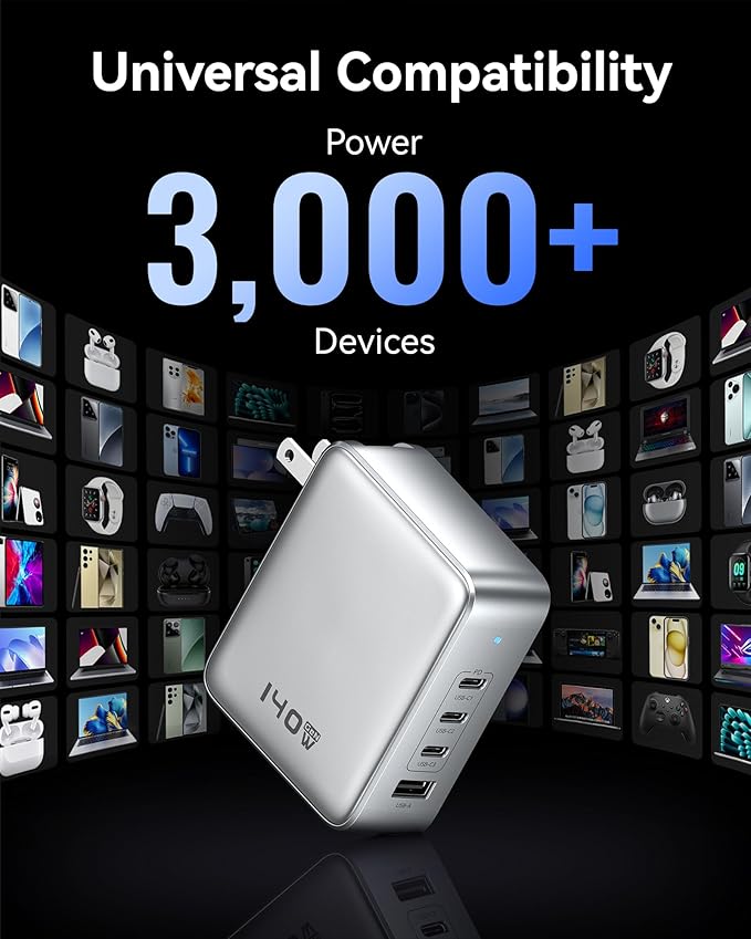 140W GaN USB C Wall Charger, 4-Port PD3.1 Laptop Charger Block Foldable Compact PPS Fast Power Adapter for MacBook Pro/Air, Dell XPS, iPad Pro, iPhone 17/16 Pro, Galaxy S25/S24, Steam Deck, and More