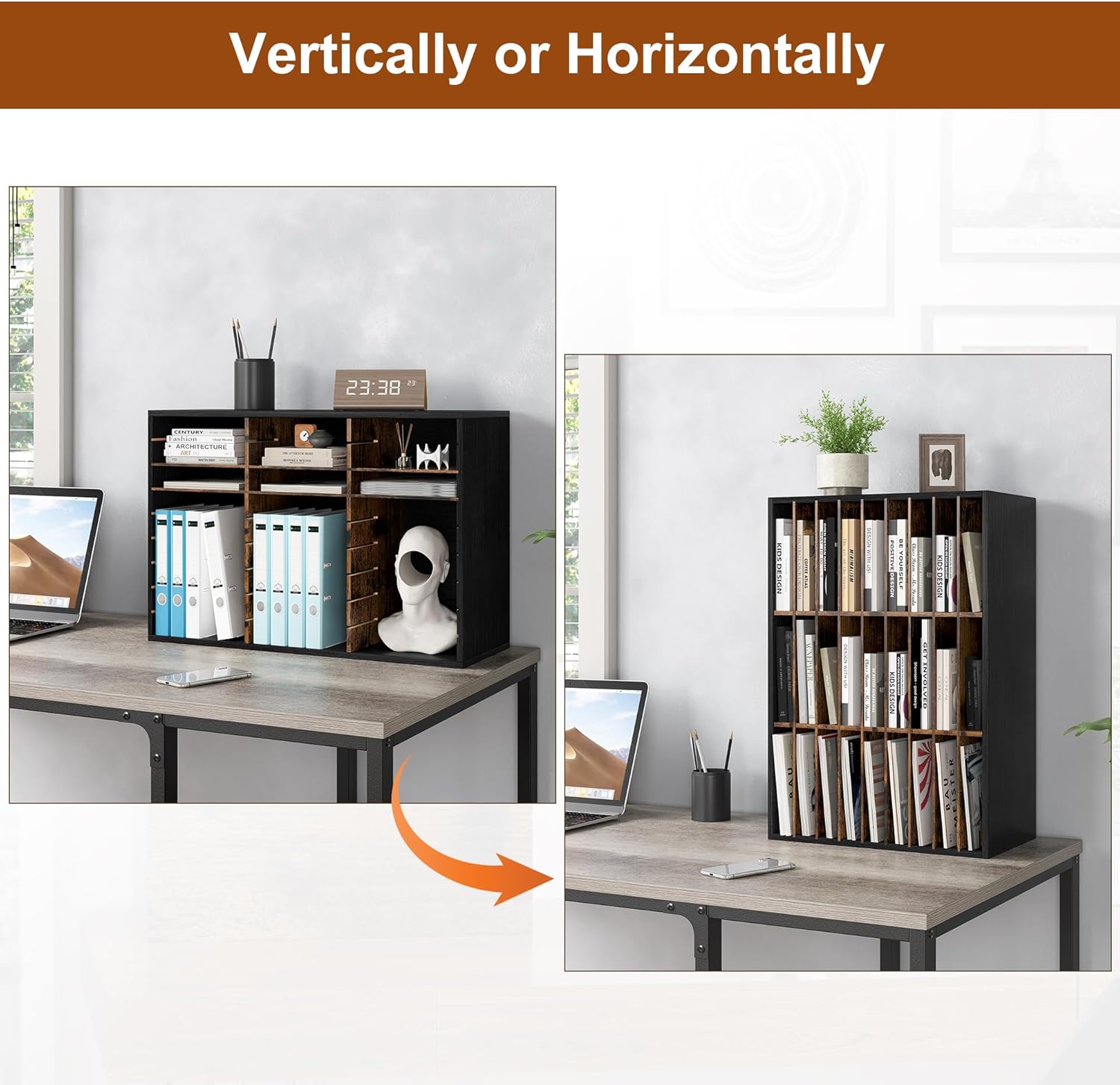 Mail Organizer Countertop, 27 Slots Wooden Desk File Literature Sorter, Adjustable Paper Storage Shelves Document Holder, Space Saving Desktop Mailbox for Office Classroom, Black/Rustic Brown