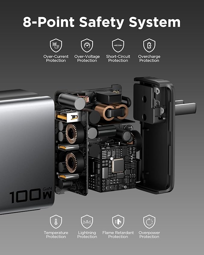 - [Wide Compatibility]: PISEN 100W GaN charger all ports support (quick charge) agreement, it's compatible for MacBook Pro/Air, iPhone 16, iPhone 15, iPhone 14 or previous models, iPad Pro/Air, Galaxy S10 or previous models, Google Pixel, Dell XPS, Switch, and more.