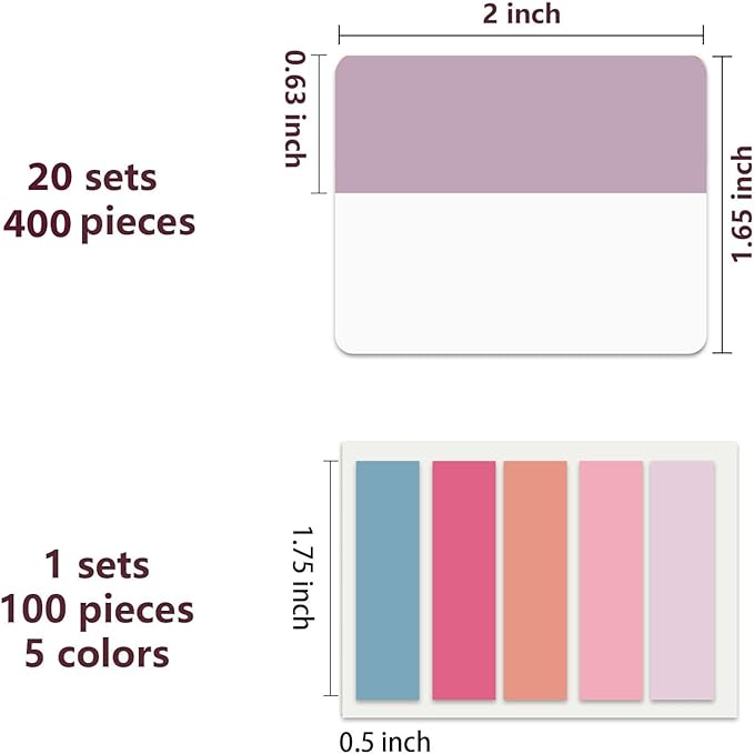 - Book Tabs: 500 pieces 21 sets in total, 400 pieces 2 inch sticky tabs in 20 sets with 10 different pastle colors,100 pieces 0.5 in tabs in 1sets, 20 pieces each color
