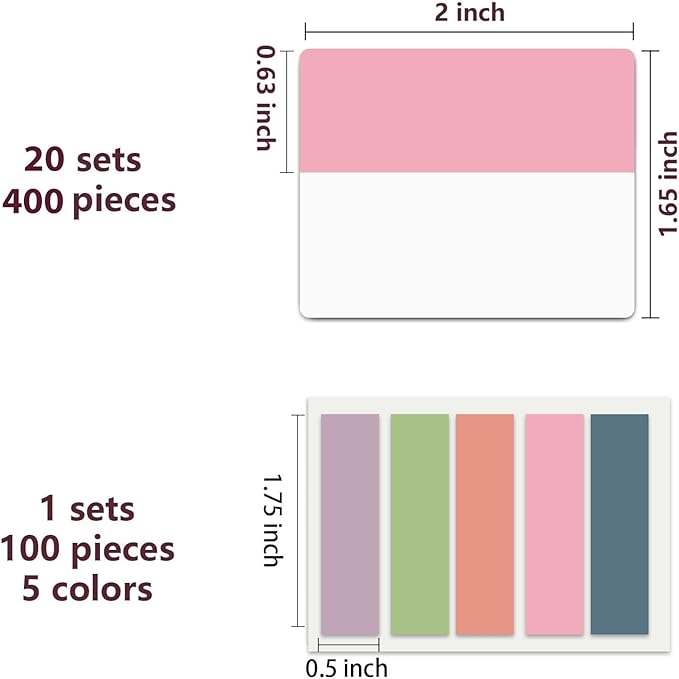 - Sticky Tabs: 500 pieces 21 sets in total, 400 pieces 2 inch sticky tabs in 20 sets with different pastle colors,100 pieces 0.5 in tabs in 1sets, 20 pieces each color
