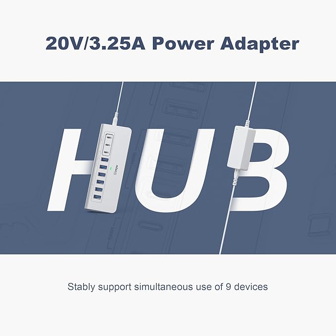 - Powerful 65W Power Adapter: With a 65W (20V/3.25A) power adapter, our USB hub 3.2 ensures a stable data transfer and supplies sufficient power for all connected devices. Protect your devices from overload, over-voltage, over-current, short circuit and overcharge, ensuring your safety and efficiency with the built-in surge protector design
