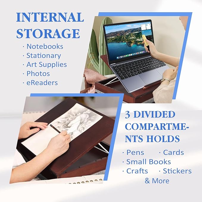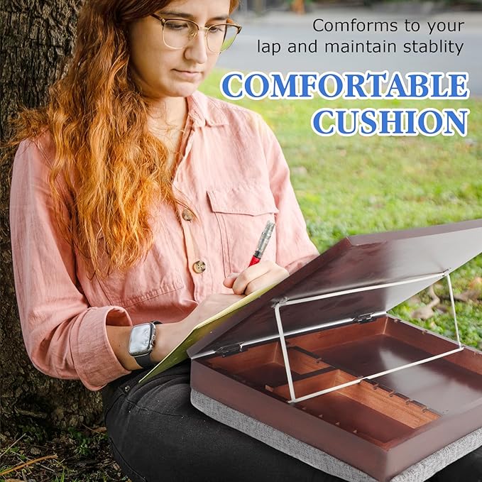 - 【Adjustable Easel & Hidden Storage】- Our laptop desk with cushion provides adjustable tilt angle & height, allowing you to adjust the easel to the most comfortable position according to your needs for typing, reading or drawing. Hidden storage can place notebook, pen or small gadgets to keep your workspace neat