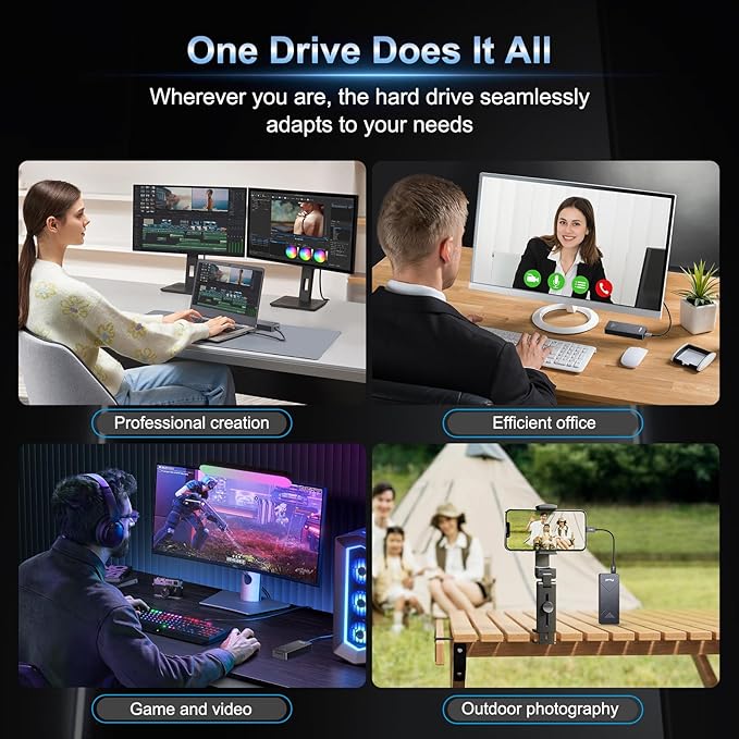 - 【Widely Compatible】FP110 Solid State External Hard Drive requires no software installation; simply plug and play. It supports both Thunderbolt 3/4 (40Gbps) and USB-C (10Gbps) dual modes, making it compatible with devices such as iMacs, MacBooks, iPads, iPhone15/16 series models, Android phones, Smart TVs, Xbox game consoles, as well as various operating systems including Windows, macOS, Linux, and Android.