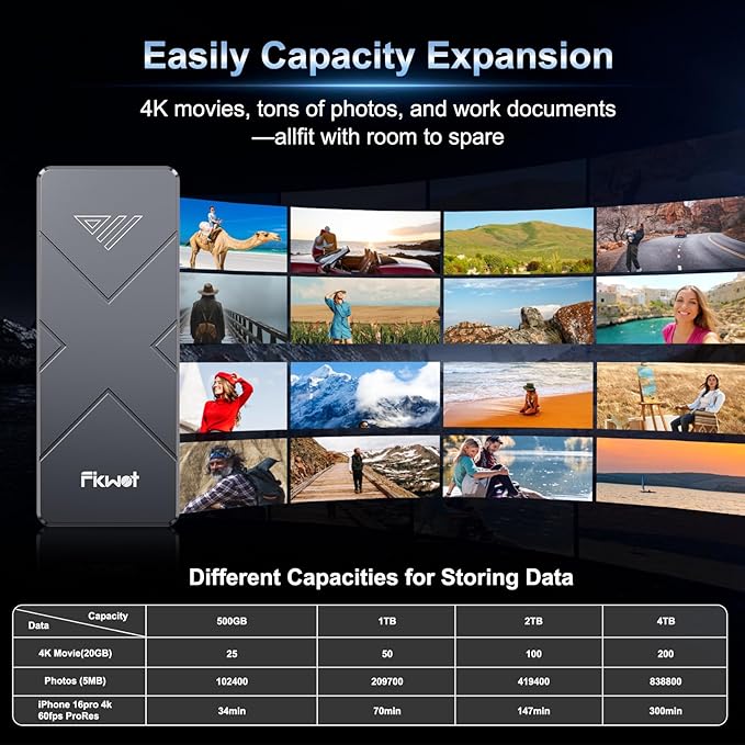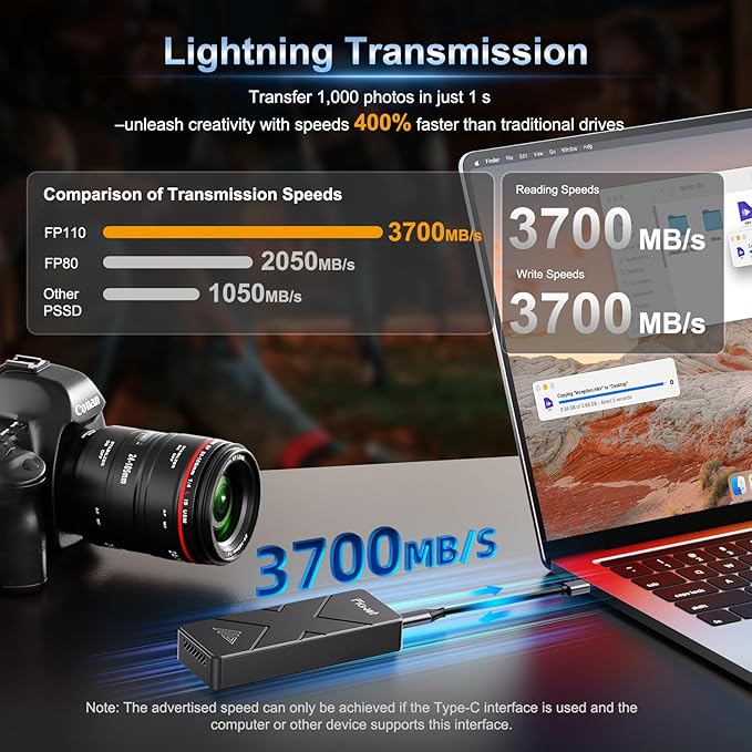 - 【Widely Compatible】FP110 Solid State External Hard Drive requires no software installation; simply plug and play. It supports both Thunderbolt 3/4 (40Gbps) and USB-C (10Gbps) dual modes, making it compatible with devices such as Mac Mini, MacBooks, iPads, iPhone15/16 series models, Android phones, Smart TVs, Xbox game consoles, as well as various operating systems including Windows, macOS, Linux, and Android.
