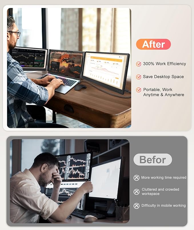 - Triple Screen Sync & 300% Increased Work Efficiency: The laptop screen extender adds two additional displays, enabling seamless multitasking. Whether in extended mode or mirrored mode, you can easily manage multiple windows without frequently switching between workspaces, improving your work efficiency by up to 300%. Suitable for IT professionals, stock traders, students, and more.