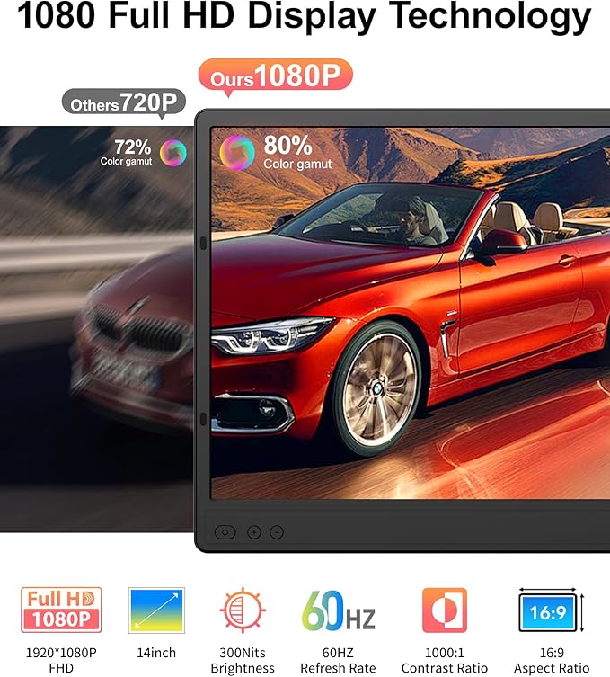 - HD Display & Multi-Angle Support: Dual monitor extender equipped with a 14-inch Full HD IPS display, it offers 1920x1080 resolution, 300 nits brightness, and a 1000:1 contrast ratio, delivering vibrant and rich colors. Each screen supports brightness and volume adjustment for a comfortable work and entertainment experience, reducing eye strain. The portable laptop monitor upgraded widened back stand increases desktop support and provides more stable support, while the adjustable stand length allows for different screen angle adjustments.