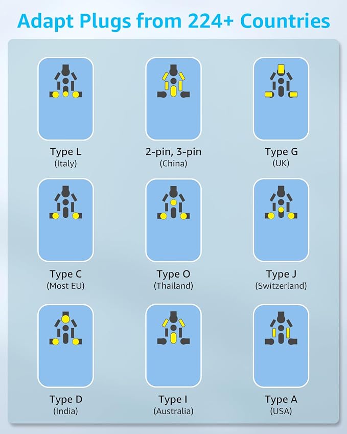 - [Worldwide Compatibility] decqle universal travel adapter is designed with 4 interchangeable plugs which meet international plug standard: 1.Type C(most of the Europe) 2.Type G(such as UK, Ireland, Singapore) 3.Type A(such as America, Canada, Mexico) 4.Type I(such as China, Australia, New Zealand). It can cover 224+ countrires plug standards.Note: NOT for Type D (mostly used in India), Type M (mostly used in South Africa) and Korea.