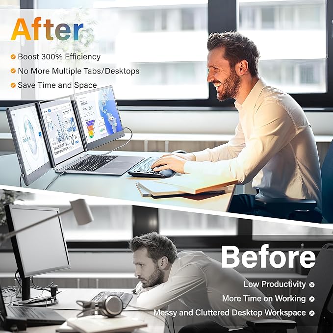 - [Triple screen, Triple efficiency] The portable monitor is the perfect triple screen monitor for laptop, allowing you to open multiple windows simultaneously without switching back and forth continuously on a single laptop screen, improving your efficiency by up to 300%. With this monitor extender for laptop, you can easily build your own working station anywhere. Very suitable for conference presentations and multitasking. Perfect for gamers, programmers, finance and investment professionals, designers, and anyone who needs more efficient workflows.