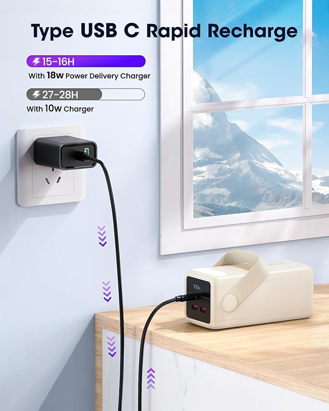 - Ultra High Capacity 70000mAh Power Bank -- The portable charger 70000mAh has a huge 259Wh capacity, measures 5.79 x 3.35 x 3.03 in, and weighs 35.1 OZ (about 2.19lb). It can charge a smartphone about 10 to 21 times and provides power for over weeks, ensuring you stay connected during camping, travels, or unexpected power outages caused by hurricanes. (Note: 70000mAh power banks are not allowed on airplanes)