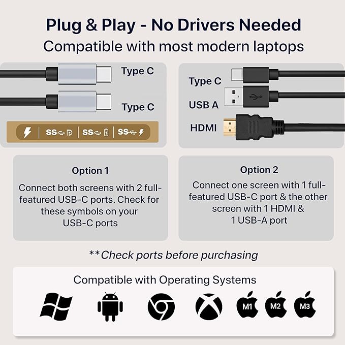 - CHECK COMPATIBILITY BEFORE BUYING - To use the monitors without an external power source you need to check our images for which ports you need. If you use an older model laptop you might have to use an external power supply for the screens. Our included instructions and starter video guide will walk you through everything!