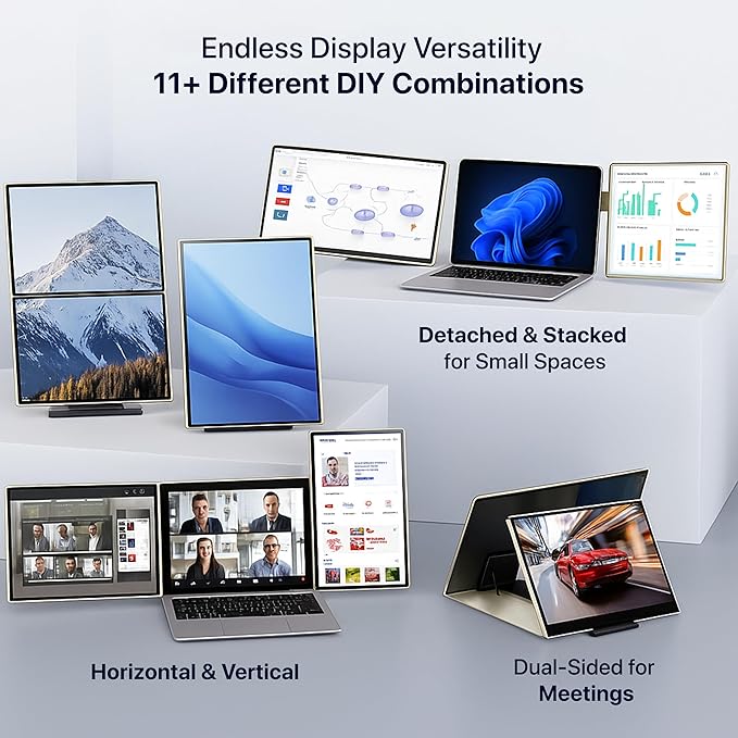 - THE MOST VERSATILE DESIGN - Our dual screen monitor for laptop is the newest on the market. Allowing you to adjust, rotate & detach however you want. There are 11+ different combinations to display your screens to your liking. The instruction manual will show you all possible set-ups!