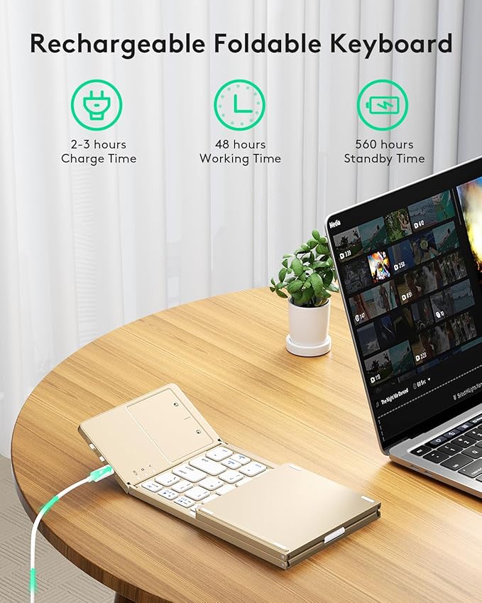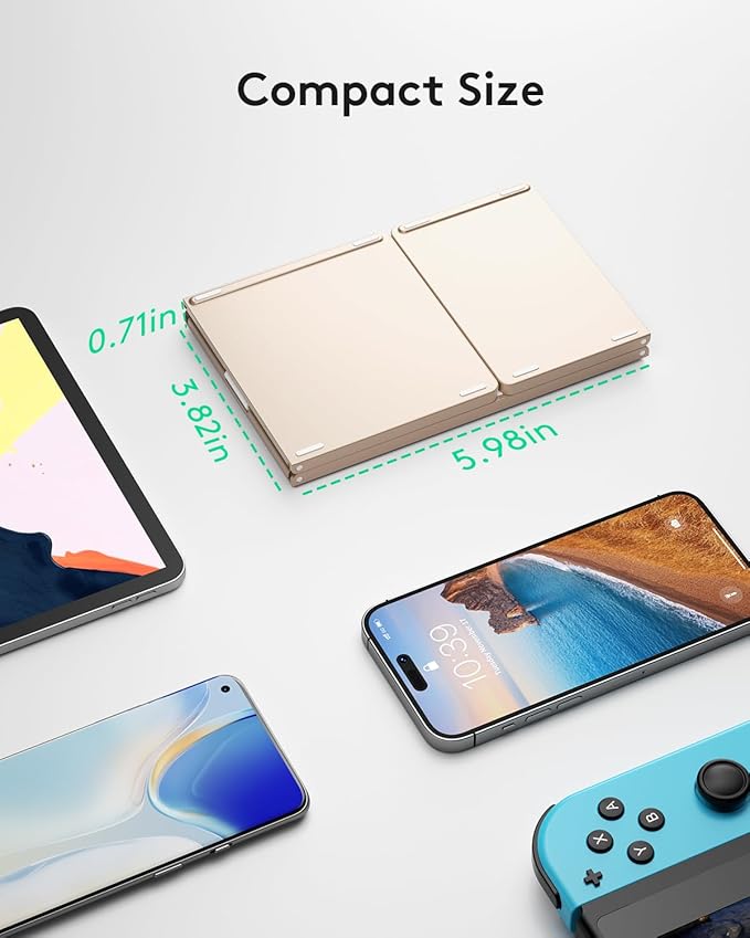 - 【Exquisite & Lightweight Portable Keyboard】Golden matte exterior, made of ABS+PC material, lightweight but sturdy, without fear of daily wear and scratches. The elegant matte design, excellent touch and clean look make it a perfect match for your tablet, phone and laptop. Only 5.53-ounce, palm-sized keyboard can be folded up and carried around. Provide you with maximum convenience with minimal weight and size. It must be a good choice for editors!