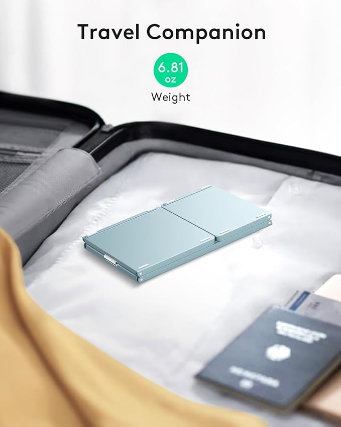 - 【Exquisite & Lightweight Portable Keyboard】Young Blue matte exterior, made of ABS+PC material, lightweight but sturdy, without fear of daily wear and scratches. The elegant matte design, excellent touch and clean look make it a perfect match for your tablet, phone and laptop. Only 5.53-ounce, palm-sized keyboard can be folded up and carried around. Provide you with maximum convenience with minimal weight and size. It must be a good choice for editors!