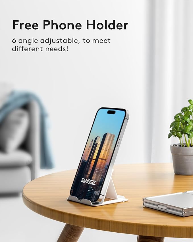 - 【Folding Bluetooth Keyboard & Stand Holder】Extremely thin design of the portable folding keyboard allows you to fold it up and put it in your pocket or bag without taking up too much space. The Phone stand holder, best companion for folding keyboard, gives you perfect screen angle. Near-standard size design provides accurate, fast typing, just like the desktop keyboard you are used to. Quiet keys also allow you to focus on your work. Perfect gift for travel and business trips!