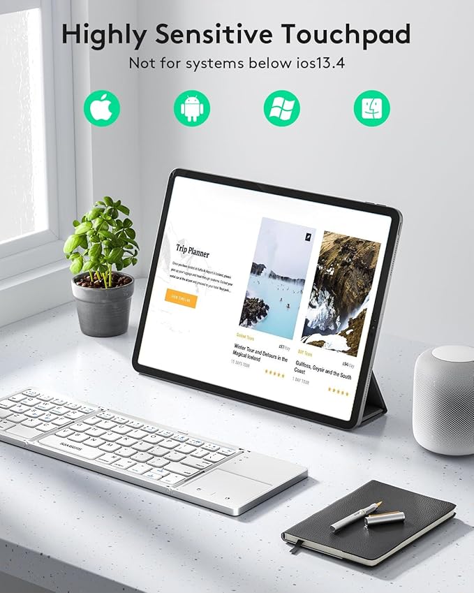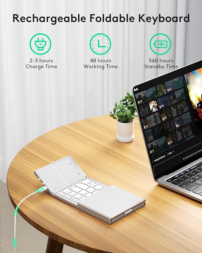 - 【Sensitive Touchpad Foldable Keyboard】Upgrade sensitive touchpad supports mouse left and right key function, so you can control the device without using mouse. Updated richer and more practical multimedia shortcut functions make your work more convenient and more efficient! Built-in rechargeable battery can last for 48 hours or 560 hours after 2-3 hours of charging. One full charge last enough for your short business trip or vacation!