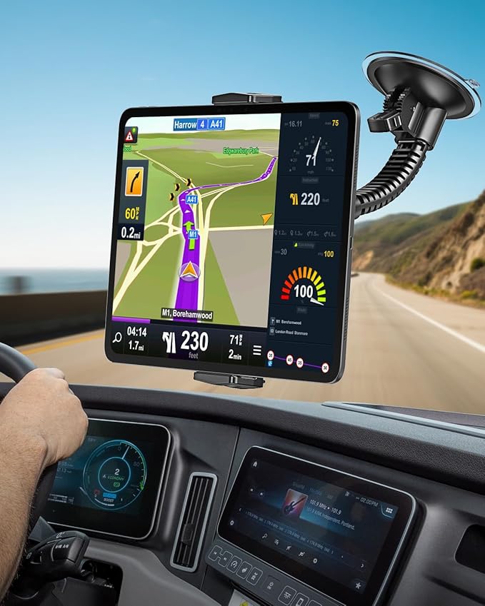 - Superior Suction for Maximum Stability: Featuring a 4.33" extra-large suction cup and a ratcheting pressure lock, this heavy-duty suction cup tablet mount secures firmly to your windshield, keeping your device steady through rough roads and sudden stops