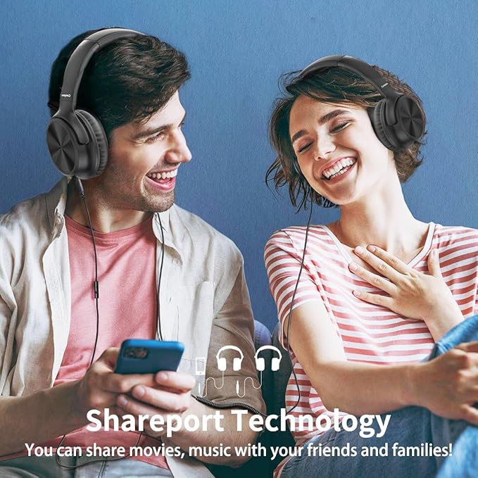- 【Immerse Yourself into the Music】3.5mm Wired headphones with microphone adopt High-definition 40 mm driver and compact earcups design, which deliver clear sound. Effortless style and powerful sound let you tune into your own rhythms with the set of over-ear headphones. You can easily use these stereo wired headphones for your workouts, job commute or just for listening at home. With a shared 3.5mm audio port, easily connect another pair to share music or videos—no splitters or special cables needed