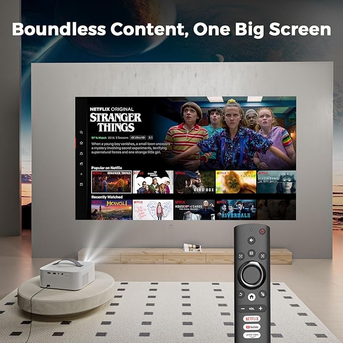 - [Built-in APPS, Enjoy a Global Feast of Entertainment] Step into a world of endless entertainment with the L61 Pro portable projector. It offers the ultimate viewing experience right out of the box. Unlike unauthorized Android TV projectors, this video projector offers one-click access to top streaming platforms. Compatible with Netflix/YouTube/ Prime Video, without extra devices needed. Thanks to a vast library with millions of videos, your favorite shows and movies are always at your fingertips. The professional team regularly maintains and updates the app to ensure you have the latest features, while also providing comprehensive security and stability