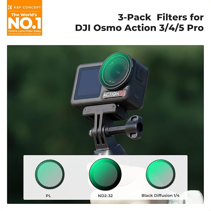 - Compatible With DJI Osmo Action 5 Pro/Action 4/Action 3: This Variable ND Filter kit from K&F Concept includes ND2-32, CPL, and Black Diffusion 1/4 filter, featuring multi-coated, instant push in fit, easy to install and disassembly, ideal for shooting skiing, surfing, riding or rock climbing, mountain biking, water surfing and other sports in the first perspective view