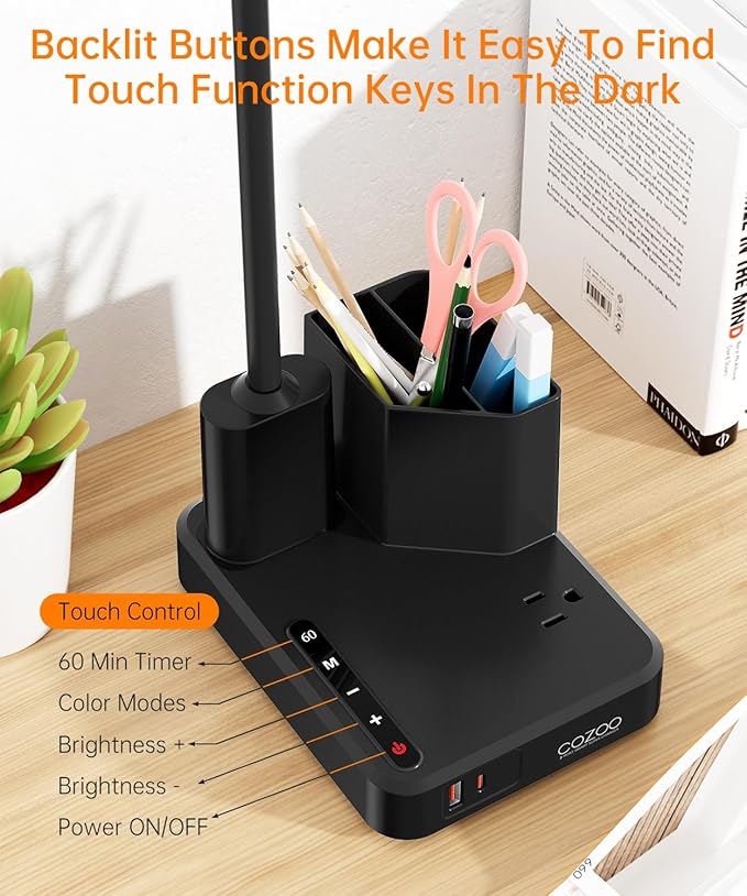 Desk Lamp, COZOO LED Desk Lamps for Home Office with USB Charging Port/Outlet/Organizer,Desk Lamp for College Dorm Eye-Caring Study Light,Gooseneck Table Lamp with Pen Holders/Storage,9 Lighting Modes