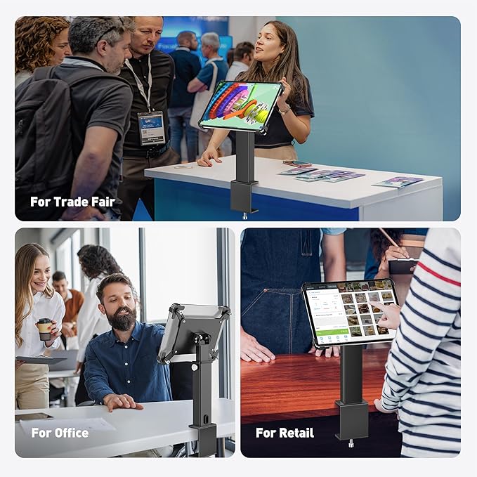 - Secure and Anti-Theft Design – Designed for both home and public use, the tablet clamp mount comes with an anti-theft screw and lockable bracket. This ensures your device stays securely mounted, perfect for offices, retail displays, or other high-traffic areas.