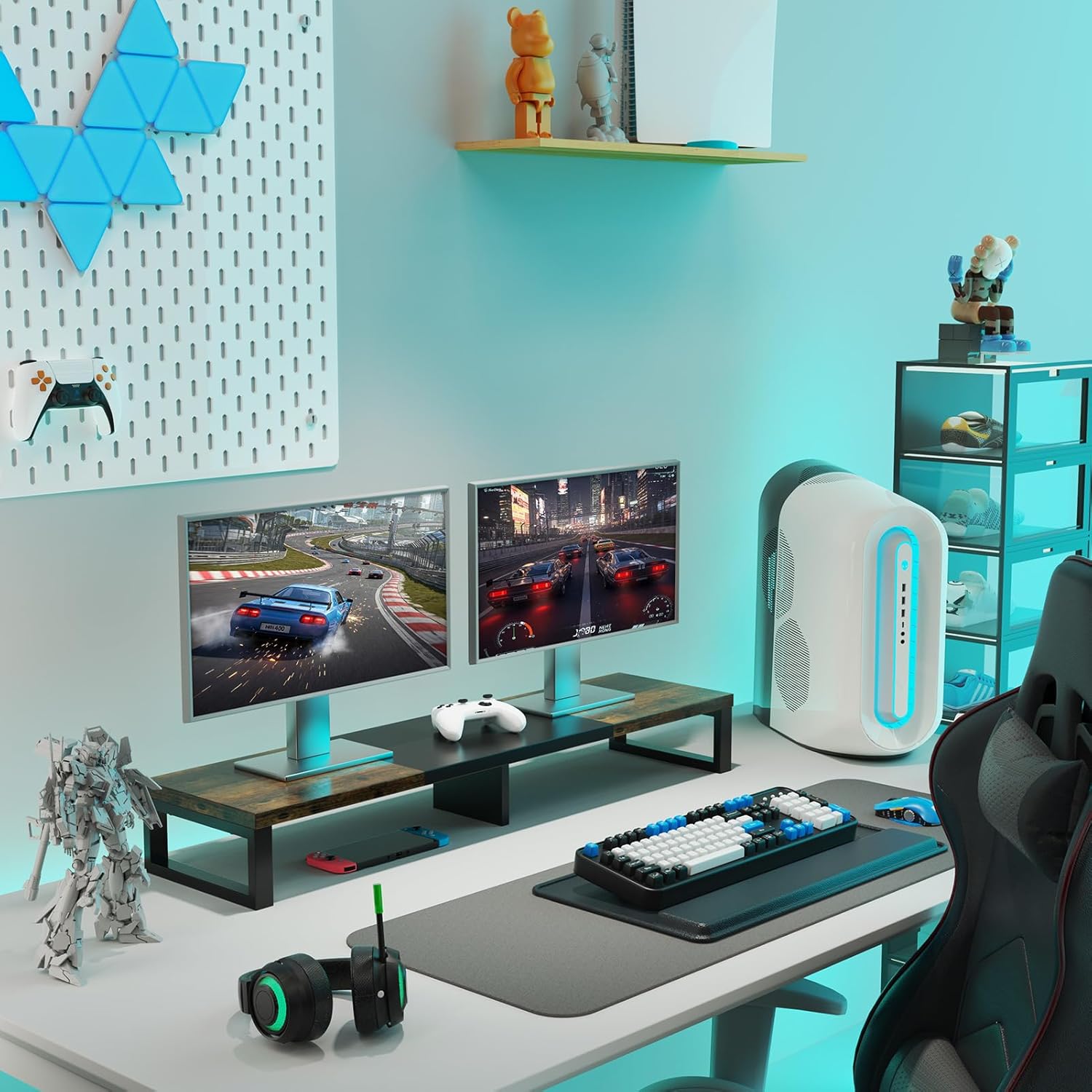 - Spacious Storage Underneath: This dual monitor stand riser hides full-size keyboards (up to 18.8"), mice, and office gear in its sleek undercarriage storage – essentials stay accessible while clutter disappears.