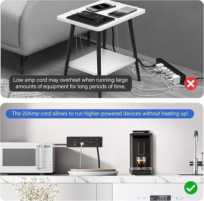 - 6FT Heavy duty extension cord 12 awg, can perfect for carrying 15Amp, 1875w of full power. And running a lot of equipment for long periods of time and without overheating.
