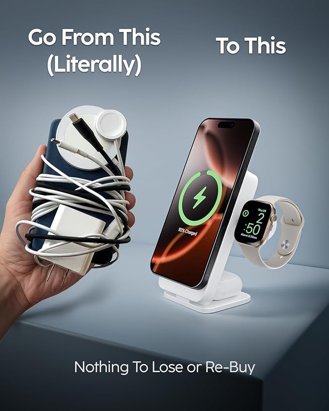 - REPLACES MULTIPLE CHARGERS, CABLES & TRAVEL GEAR – EcoHub combines a wireless phone charger, Apple Watch dock, AirPods charger, and power bank into one foldable device, eliminating clutter whether you’re at home or on the go.