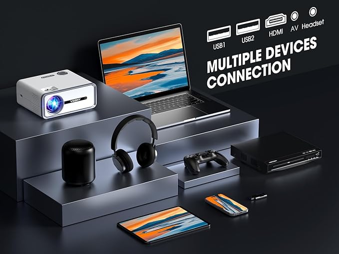 - ➤【Ultra-Fast Dual-Band WiFi 6 (5G + 2.4G)】VIONY DP04 Pro smart projector with WiFi and Bluetooth features the most advanced WiFi 6 tech, delivering blazing-fast speeds, wider bandwidth, and ultra-low latency for seamless streaming. Effortlessly share your favorite movies, shows, music, photos, and more from your iOS or Android devices to the projector screen with Screenshare (iOS), Screencast (Android), and Homeshare (for enabled casting apps). Experience unprecedented smoothness in home movies, online games, parties, outdoor activities, football matches, etc.