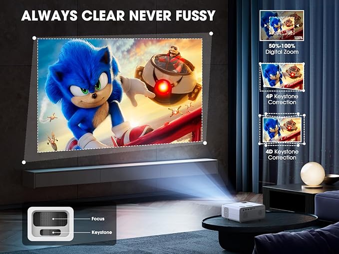 - ➤【One click for Perfect Projection】 DP04 Pro home projector advanced focus, intelligent 4D/4P keystone correction, and 50%-100% zoom functions, making projection setup a breeze. This movie projector boasts the latest LTPS 4" LCD technology, offering superior clarity, brighter brightness, and more vibrant color reproduction than other 2.69-inch screen projectors with Netflix on the market. With a 1:1.25 short throw ratio, this ceiling projector adjusts easily to your space, delivering up to a 250” screen, ideal for bedrooms, apartments, and even RV adventures.