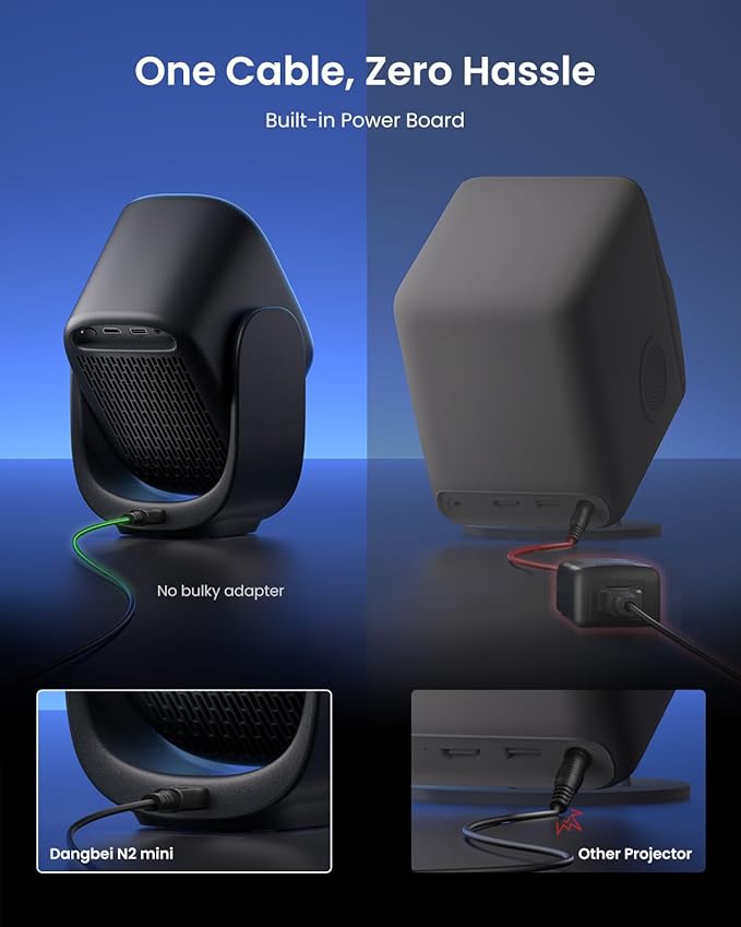 - 190° Tilt Freedom, Zero Clutter: This mini projector features a built-in gimbal stand that offers 190° tilt, allowing you to project from floor to ceiling with ease. Its integrated power board eliminates the bulky adapter, simplifying your setup with a single power cable for a clutter-free experience. Plus, the power port at the gimbal’s base ensures unrestricted tilting, providing smooth adjustments without cable interference.