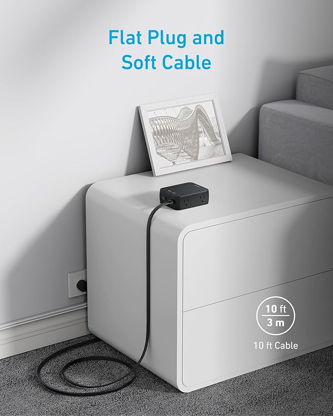 - Efficient Design, Extended Reach: Optimize your charging setup thanks to the compact design, featuring outlets on three sides, a thin 5 ft cord, and a 45° flat plug for convenient, unobtrusive power access.