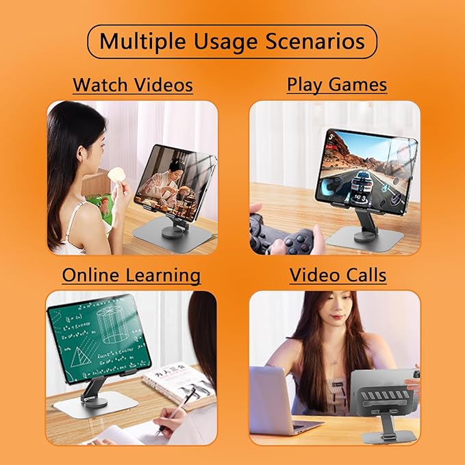 - 360° of Smooth Rotation Tri-fold adjustable: You can adjust the angle and height of the tablet stand according to your needs, whether it's for work, watching videos, or video calls, it can meet all your requirements