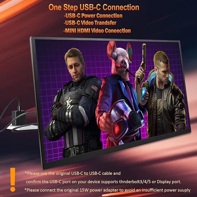 - Universal Connectivity – Plug & Play in Seconds! This portable monitor features dual USB-C ports + HDMI, making it compatible with almost any device – MacBook, Windows laptops, Surface, PC, Xbox, PS5/4, and more. Just connect a single USB-C cable (Thunderbolt 3/4/5 or full-featured USB-C required) for instant Plug & Play convenience—no extra drivers or adapters needed! Pro Tip: If you encounter screen flickering (usually due to low power), simply use the included power adapter for stable, high-performance display. Expand your screen, simplify your setup!