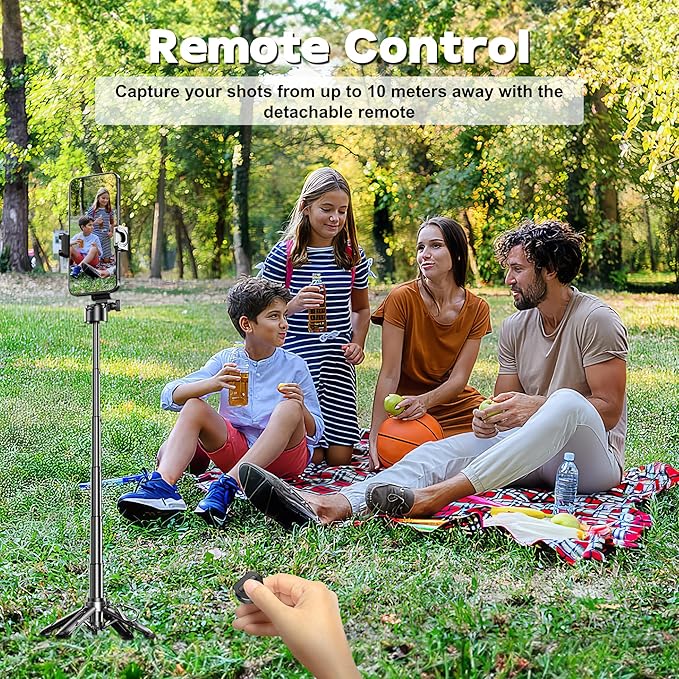 - Remote Control for Effortless Shooting Equipped with a detachable Bluetooth remote, this mini tripod allows one-click shooting from up to 10m (32.8ft) away. No need for timers or extra help—whether you're capturing solo shots or group photos, take the perfect picture with ease.