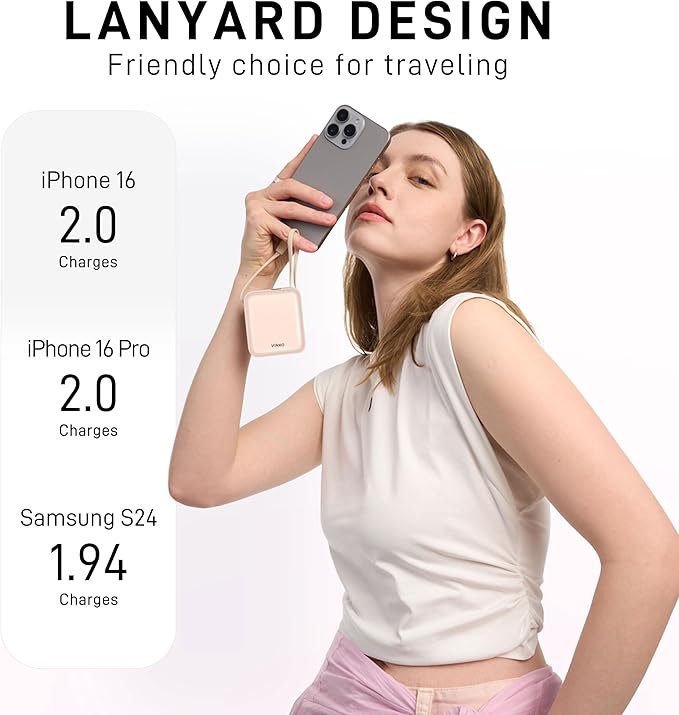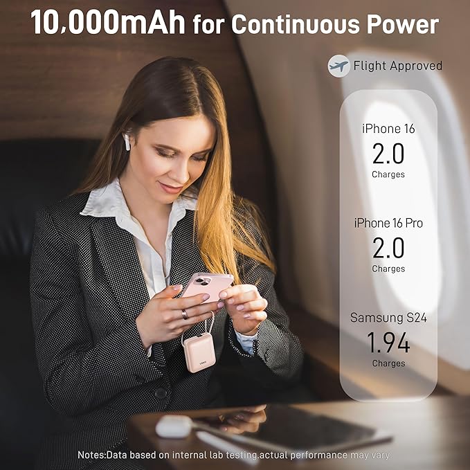 - CHARGE 3 DEVICES SIMULTANEOUSLY: The pocket charger for iphone with built in cable features 1 Type-C input/output port, 2 different built-in cables, allowing you to charge up to 3 devices at the same time. Crafted for durability, both built-in cables are tested to endure over 20,000 bends, ensuring it stands up to the rigors of everyday use, adding a touch of elegance to the portable phone chargers.