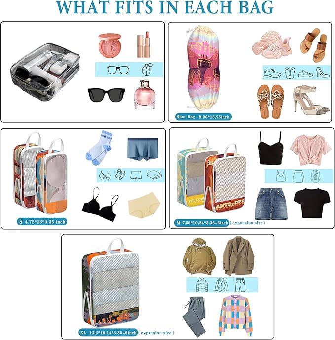 - Compression Design & Art: These unique art compression packing cubes set design by our independent designer that adopt double zipper design, which works like a vacuum sealer, can compress your clothes together, minimize the internal space. So that your suitcase can fit more things.