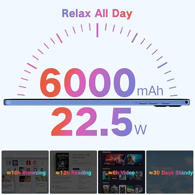 - The Battery That Lasts All Day & Then Some - The powerful 6000mAh battery delivers up to 12 hours of mixed useโperfect for a full day of daily use, keeping boy and girls entertained on long trips, or binge-watching your favorite shows at night. Spend less time tethered to an outlet and more time enjoying your 10.1 inch android tablet. Enjoy a full day with a full charge!
