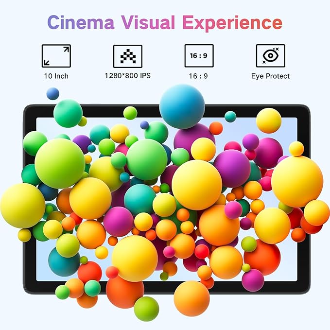 - A Vibrant,Eye-Comfort Screen - Protect your family's eyes without sacrificing a great view. 10 In tablet features a crisp IPS HD display with vivid colors and wide viewing angles, perfect for sharing cartoons with boy and girls or watching movies together. The brightness adjustment setting technology significantly reduces harmful light and minimizes screen flicker,making it safer for your late-night reading