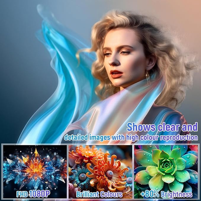 - 【HD Quality Projection】FEARWIKY mini projector supports 1080P resolution and 4K decoding, delivering clear and detailed images. It also uses advanced colour technology and supports HDR10, HLG and other formats to reproduce true colours. The optimal projection distance is 5.51 feet, with a projection size of 60 inches.