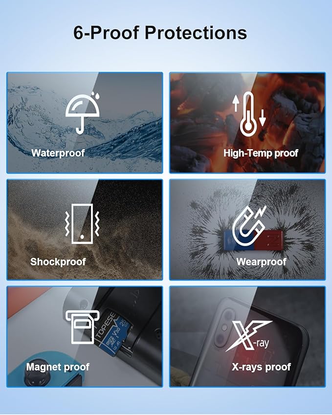 - Durable & Reliable: Built to withstand harsh conditions, this Micro SD card is waterproof, shockproof, temperature-proof, and X-ray-proof, ensuring your data stays safe in extreme environments. Perfect for outdoor adventures and professional use