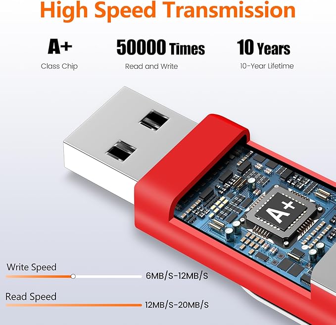 - STABLE & FAST TRANSMISSION: The 8GB USB 2.0 memory stick adopts Grade A+ chips, read speed of 12-20 MB/s and a write speed of 6-12MB/s.It resists temperature fluctuations and X-ray, ensuring data integrity and preventing loss
