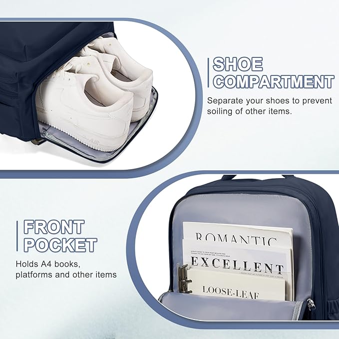 - Spacious Travel Backpack: Features dual main compartments to easily store personal items and clothing for quick access. It also includes two front pockets—a smaller one for daily essentials and a larger one that fits a 14-inch laptop—plus two side pockets for water bottles or umbrellas. The casual backpack also has a separate shoe compartment to keep footwear isolated and protect your belongings.