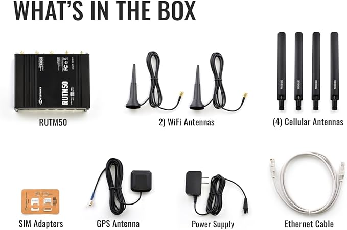 - Included Components : Router, 2 x WiFi antennas, 1 x GNSS Antenna, 4 x Mobile Antennas, Power Supply, Ethernet Cable, SIM Adapter Kit Router, 2 x WiFi antennas, 1 x GNSS Antenna, 4 x Mobile Antennas, Power Supply, Ethernet Cable, SIM Adapter Kit