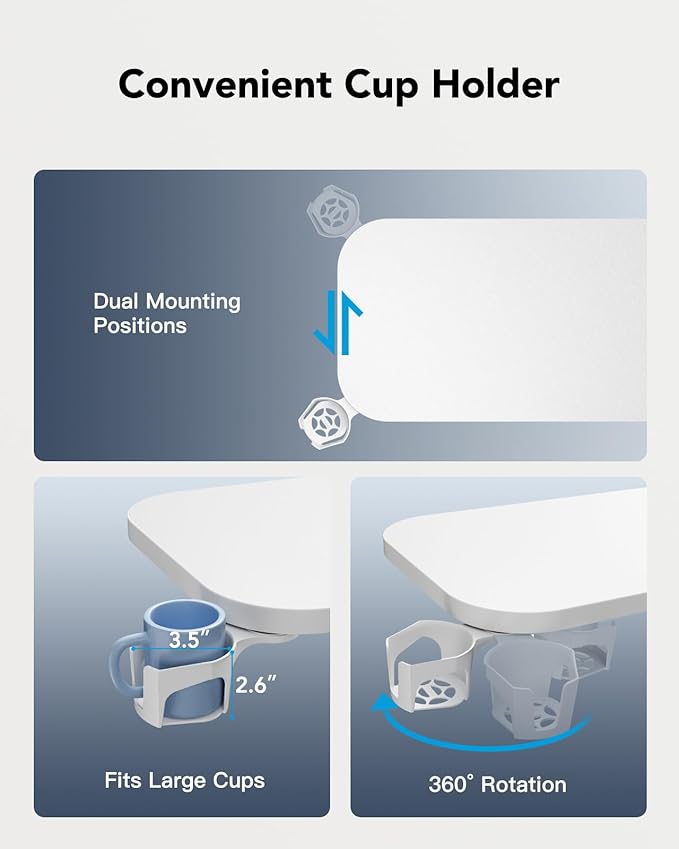 - Convenient Cup Holder: This adjustable overbed table includes a 360° rotating cup holder designed with two pre-drilled mounting holes, so you can install it on either side. Whichever way you sit or stand at the desk, you’ll have your cup in the right place and won’t knock it over with your elbow. When not in use, simply rotate the holder under the side table out of sight. It fits coffee mugs, water bottles, or even pen holders.