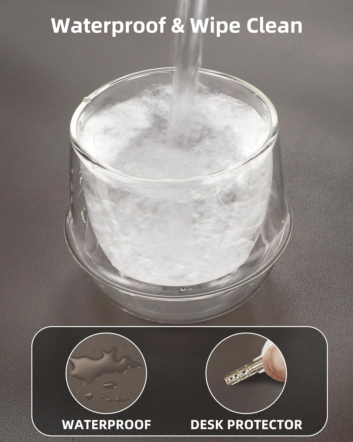 - DESK PROTECTOR:Triple-Threat Protection + Workspace:Engineered to shield desktops from scratches, coffee rings (heat-resistant to 212°F), and spills (wipes clean for 24hrs). Reinforced with stealth-matched jet-black stitching that locks in durability. Serves as:Surface can be used as a large mouse pad, comfortable resting surface for your hands while writing, typing, and using the mouse. A must have office or study supplies.