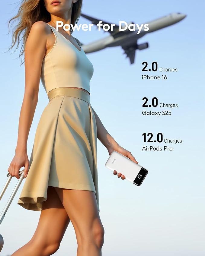 - 【Ultra-Slim & Travel-Ready Portable Charger】 Engineered to be as think as a smartphone (0.59in) and lighter than a soda can (8.4oz), this pocket-sized power bank slips easily into bags, pockets, or purses for on-the-go convenience.